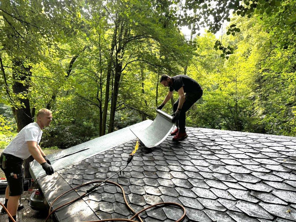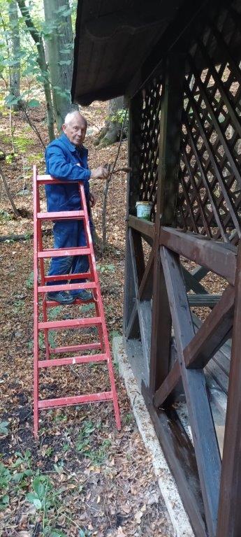 Rund um den kleinen Holzpavillon wurde Ordnung geschaffen, um ein Gerüst für die Reparatur des Daches aufstellen zu können. Die Familie Werner Pinkau stellte uns die notwendige Rüstung zur Verfügung. So konnten beidseitig des Daches die teilweise marode Dachschalung ausgetauscht werden. Anschließend wurde durch die Fa. Jurk das Dach mit neuer Dachpappe versehen, so dass es nun wieder einen zuverlässigen Schutz vor Wind und Wetter bietet. Zudem erhielt das gesamte Holz eine frische Lasur, die nicht nur schützt, sondern auch optisch das Badehäusel aufwertet.